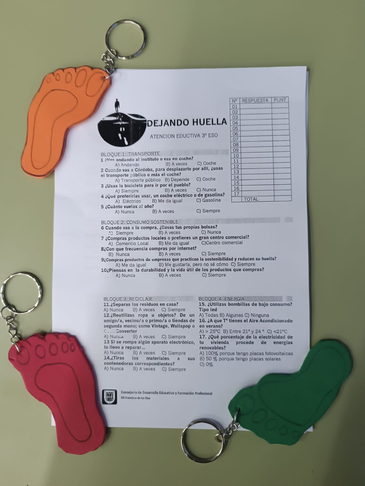 La actividad, desarrollada por el alumnado de 3º A en la asignatura de Atención Educativa, permitió a los estudiantes explorar conceptos clave como la sostenibilidad, el ahorro energético y las alternativas para reducir su huella de carbono personal. Los resultados obtenidos en la encuesta se materializaron en una huella roja, naranja o verde a modo de llavero que se repartieron entre los alumnado participante.
