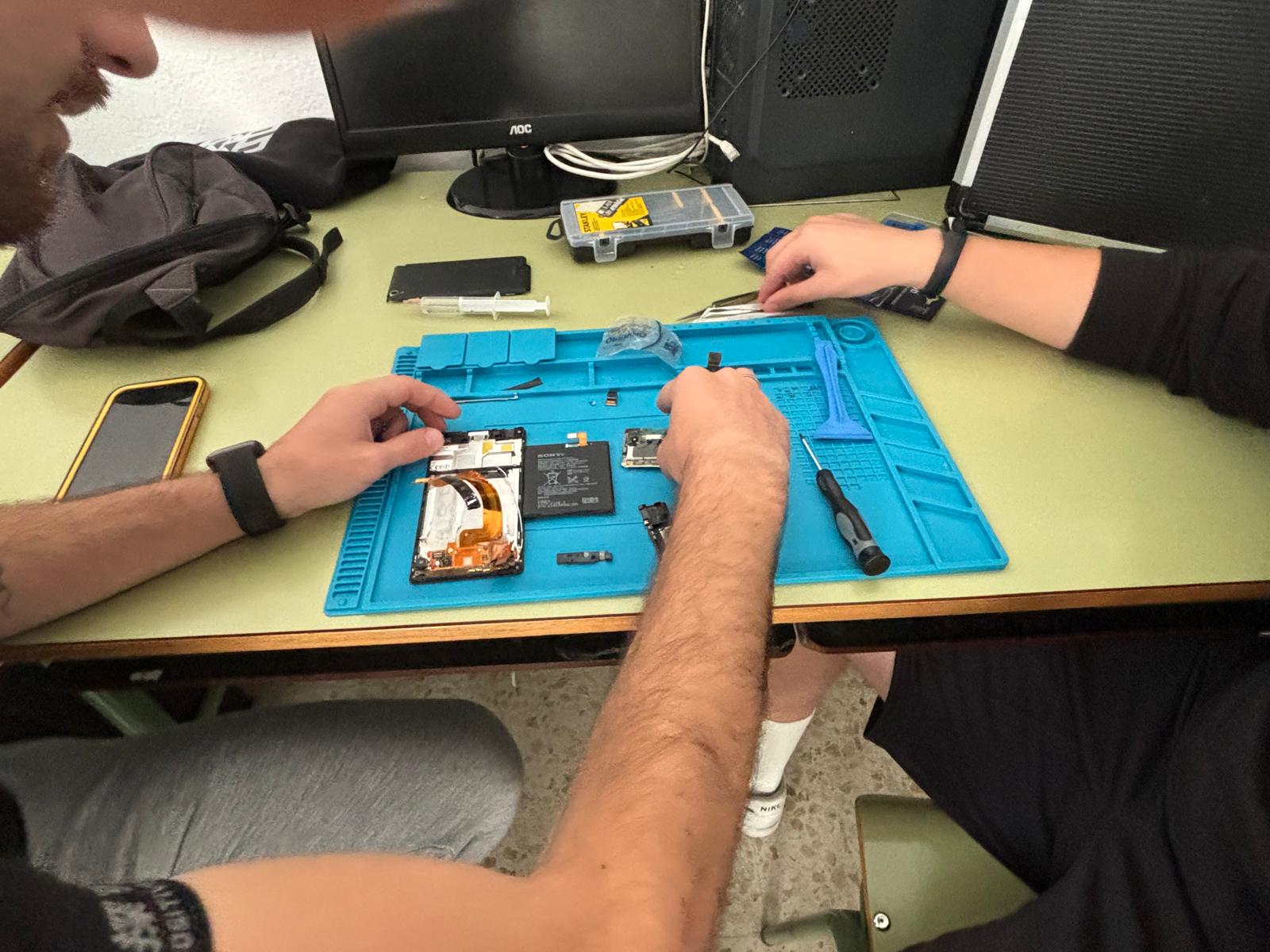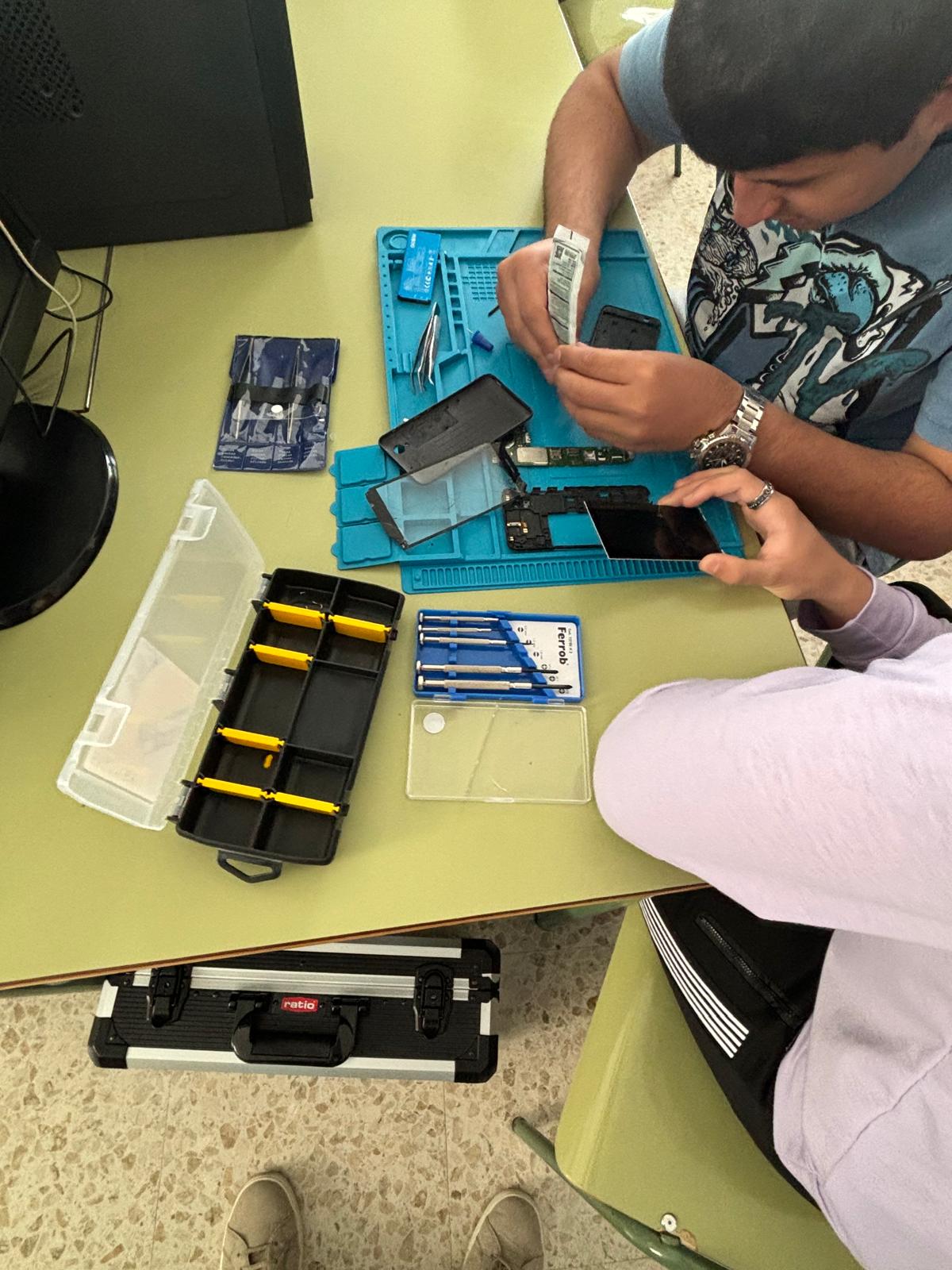Nuestros alumnos han podido sustituir pantallas de móviles y tablets, comprobar, cargar y sustituir baterías y chequear componentes sobre dispositivos desechados como con algunos que ellos mismos trajeron de casa, incluso un mando de videoconsola.